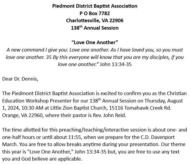 April 22, 2024, Letter of Invitation from Rev. Karen Cooper, Moderator, Piedmont District Baptist Association: